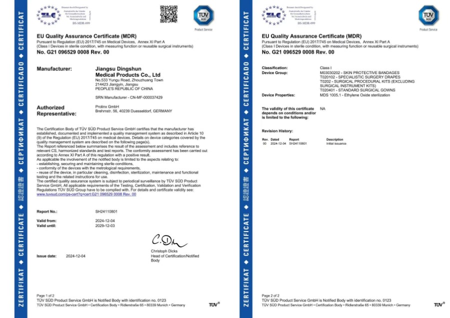 Ang Dingshun Medical ay nakapasa na ngayon sa maraming internasyonal na sertipikasyon kabilang ang CE, MDR, FDA, ISO13485 at ISO9001.